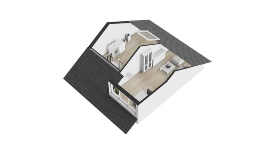 Via de trap kom je direct uit op een royale open ruimte met wasmachine aansluiting (16,6 m2), een slaapkamer met dakkapel (20,7 m2) én een technische ruimte met warmtepomp.